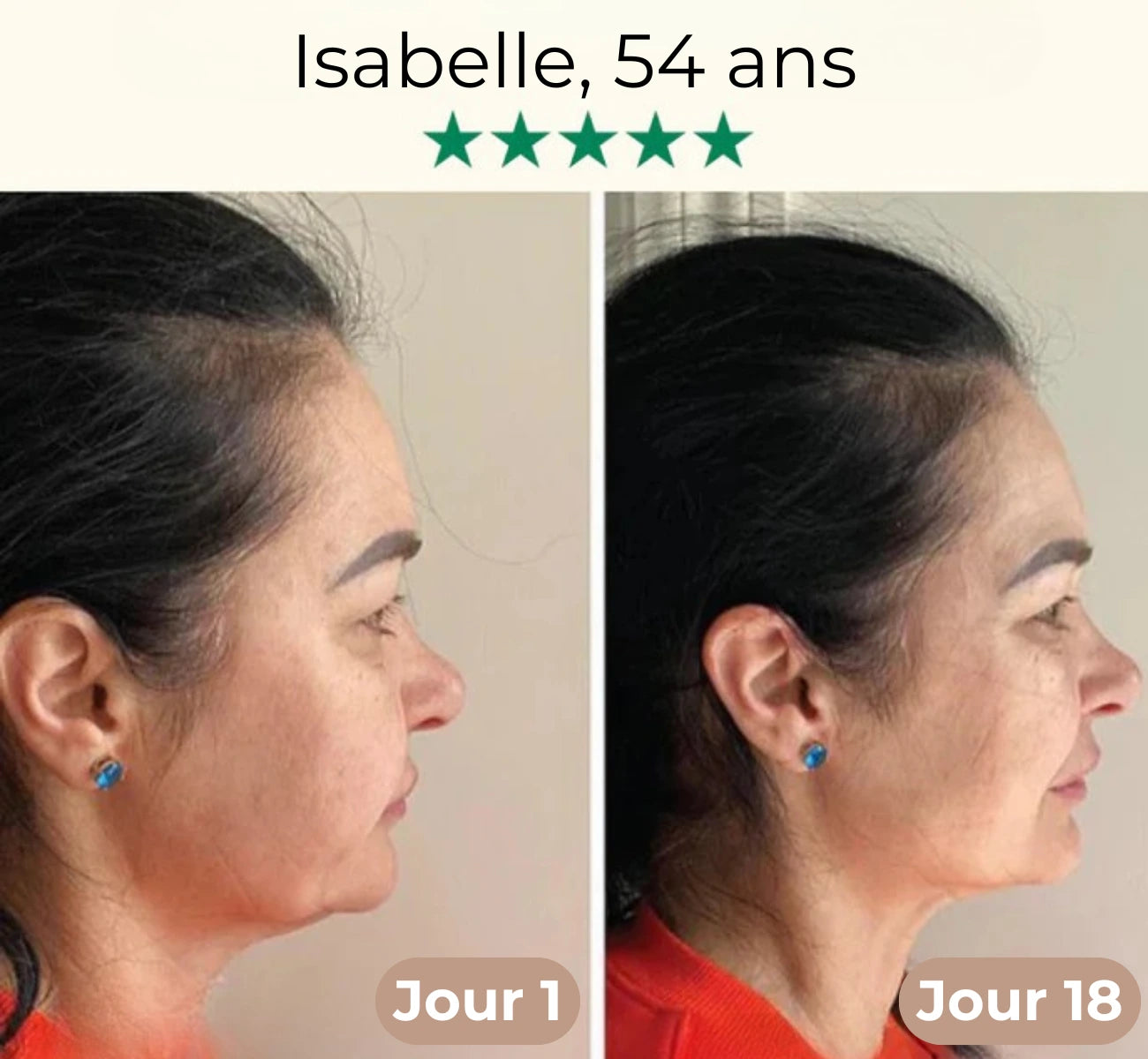 Une sensation de maintien sous le menton, un double menton réduit et un ovale visuellement plus net. L’aspect perçu varie selon la morphologie et la régularité d’usage.